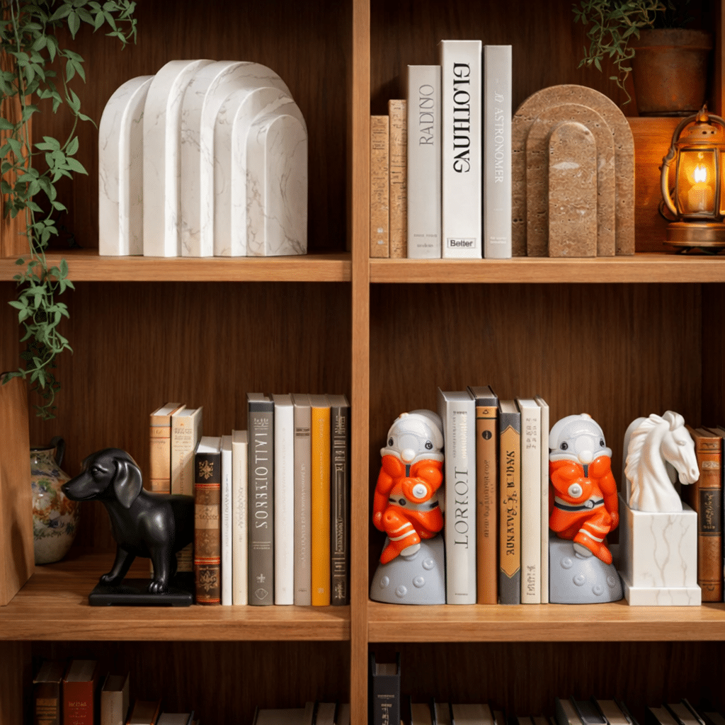 Les serre-livres design, par exemple, deviennent des objets décoratifs essentiels. Ils apportent à la fois une fonctionnalité pratique (en maintenant les livres en place) et un aspect décoratif unique. Ces accessoires, qu’ils soient minimalistes ou plus artistiques, contribuent à une ambiance propice à la concentration.